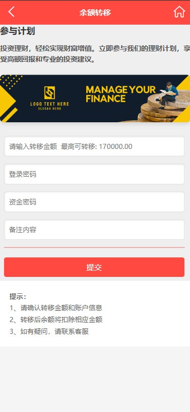 3.添加理财功能,可以将彩票盘资金一键转移到理财投资盘,无需重新注册,用户数据和输入余额一同转入,方便直接使用。
